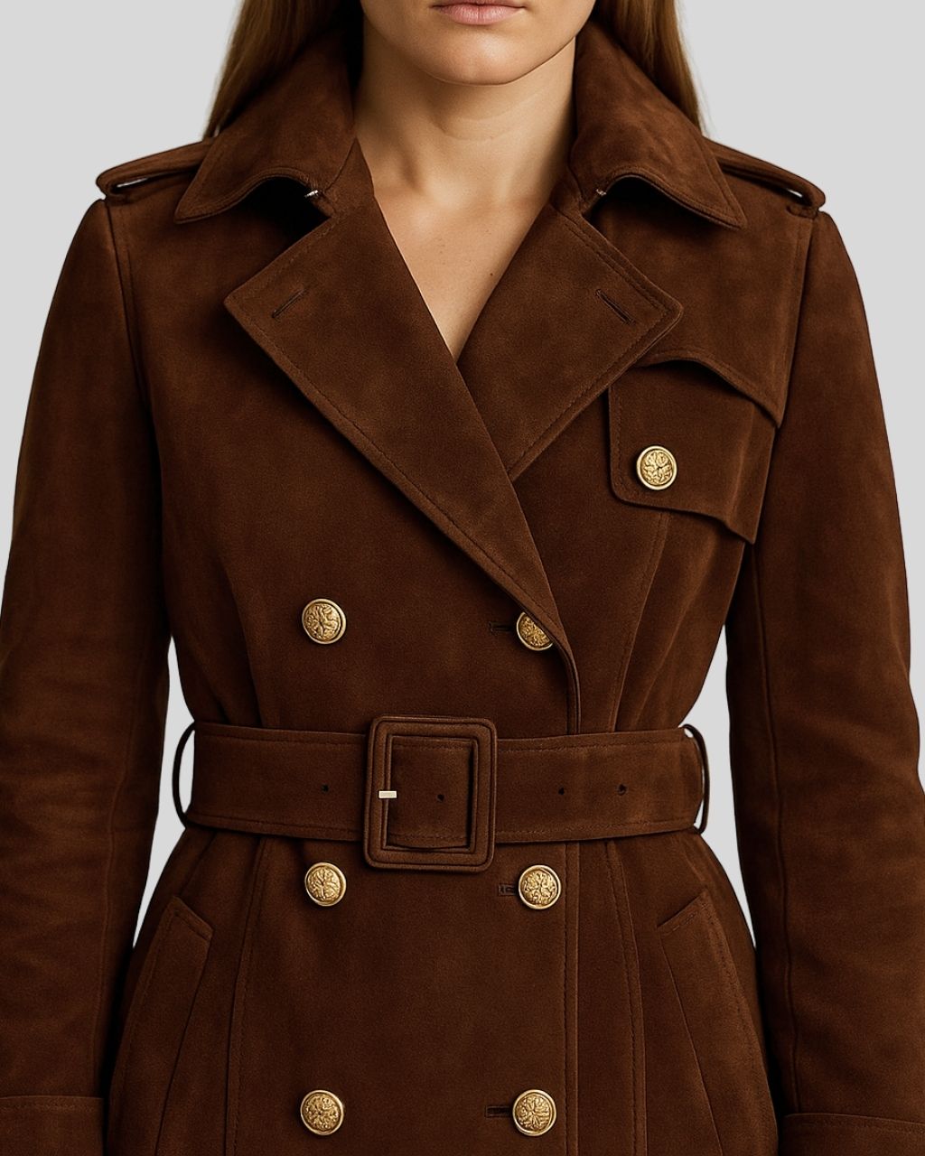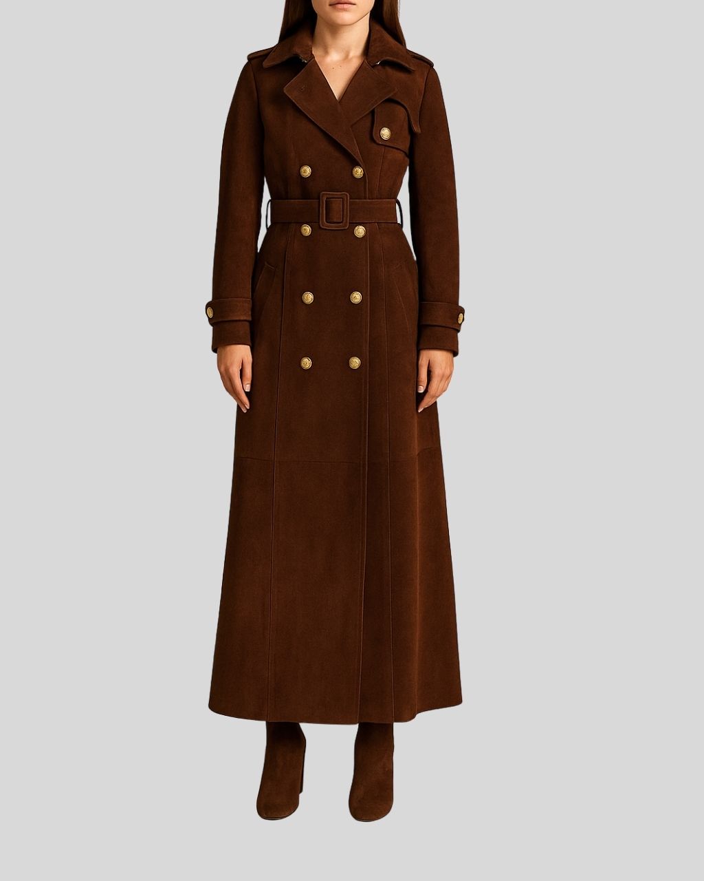 Damen Suede Langmantel – Dunkelbrauner Wildledermantel mit Gürtel, Doppelreiher & zeitlos elegantem Design